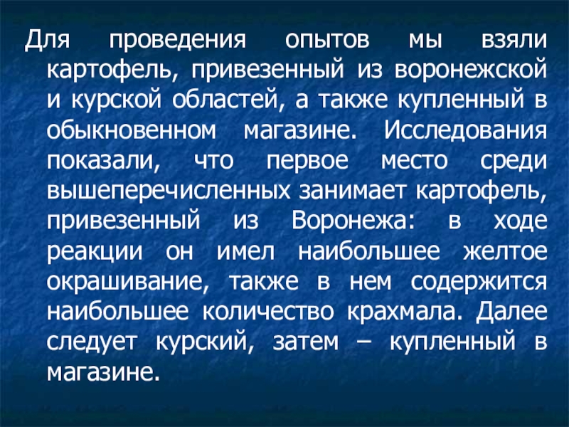 Слайд 13Для проведения опытов мы взяли картофель, привезенный из воронежской и курской