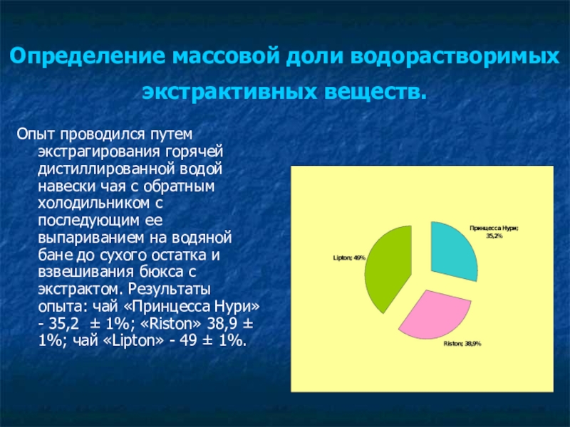 дистиллированной водой навески чая с обратным холодильником с последующим ее выпариванием на водяной бане до сухого остатка и взвешивания бюкса с экстрактом. Результаты опыта: чай «Принцесса Нури» - 35,2 ± 1%; «Riston» 38,9 ± 1%; чай «Lipton» - 49 ± 1%.