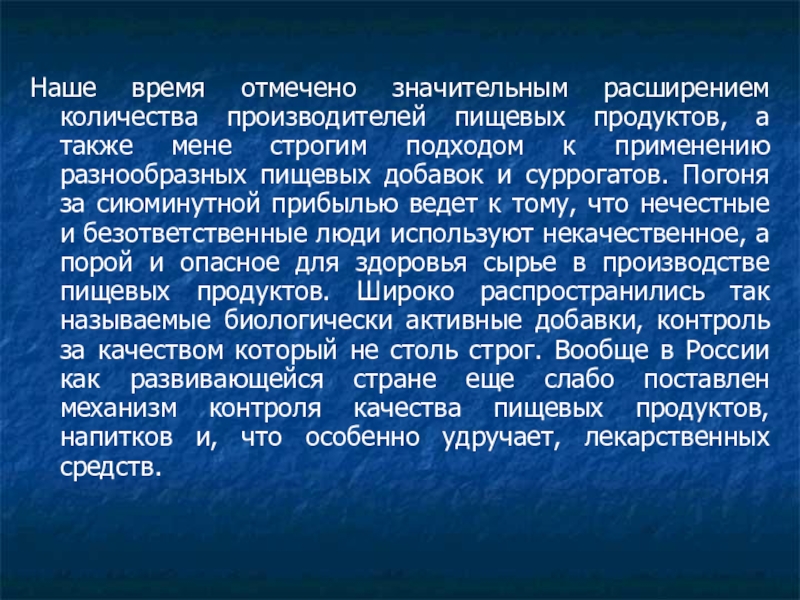 мене строгим подходом к применению разнообразных пищевых добавок и суррогатов. Погоня за сиюминутной прибылью ведет к тому, что нечестные и безответственные люди используют некачественное, а порой и опасное для здоровья сырье в производстве пищевых продуктов. Широко распространились так называемые биологически активные добавки, контроль за качеством который не столь строг. Вообще в России как развивающейся стране еще слабо поставлен механизм контроля качества пищевых продуктов, напитков и, что особенно удручает, лекарственных средств.