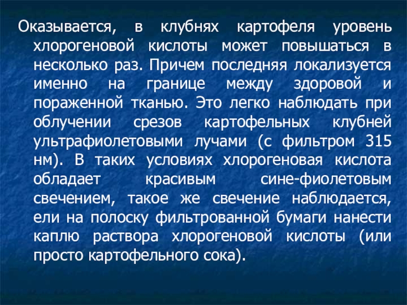 раз. Причем последняя локализуется именно на границе между здоровой и пораженной тканью. Это легко наблюдать при облучении срезов картофельных клубней ультрафиолетовыми лучами (с фильтром 315 нм). В таких условиях хлорогеновая кислота обладает красивым сине-фиолетовым свечением, такое же свечение наблюдается, ели на полоску фильтрованной бумаги нанести каплю раствора хлорогеновой кислоты (или просто картофельного сока).