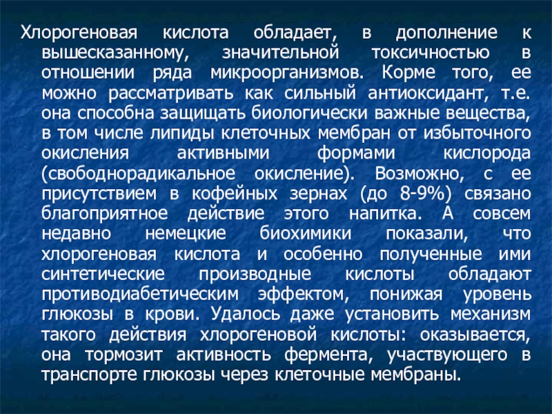 ряда микроорганизмов. Корме того, ее можно рассматривать как сильный антиоксидант, т.е. она способна защищать биологически важные вещества, в том числе липиды клеточных мембран от избыточного окисления активными формами кислорода (свободнорадикальное окисление). Возможно, с ее присутствием в кофейных зернах (до 8-9%) связано благоприятное действие этого напитка. А совсем недавно немецкие биохимики показали, что хлорогеновая кислота и особенно полученные ими синтетические производные кислоты обладают противодиабетическим эффектом, понижая уровень глюкозы в крови. Удалось даже установить механизм такого действия хлорогеновой кислоты: оказывается, она тормозит активность фермента, участвующего в транспорте глюкозы через клеточные мембраны.