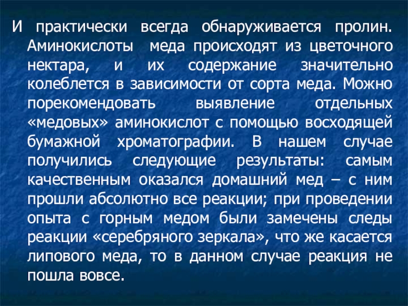 и их содержание значительно колеблется в зависимости от сорта меда. Можно порекомендовать выявление отдельных «медовых» аминокислот с помощью восходящей бумажной хроматографии. В нашем случае получились следующие результаты: самым качественным оказался домашний мед – с ним прошли абсолютно все реакции; при проведении опыта с горным медом были замечены следы реакции «серебряного зеркала», что же касается липового меда, то в данном случае реакция не пошла вовсе.