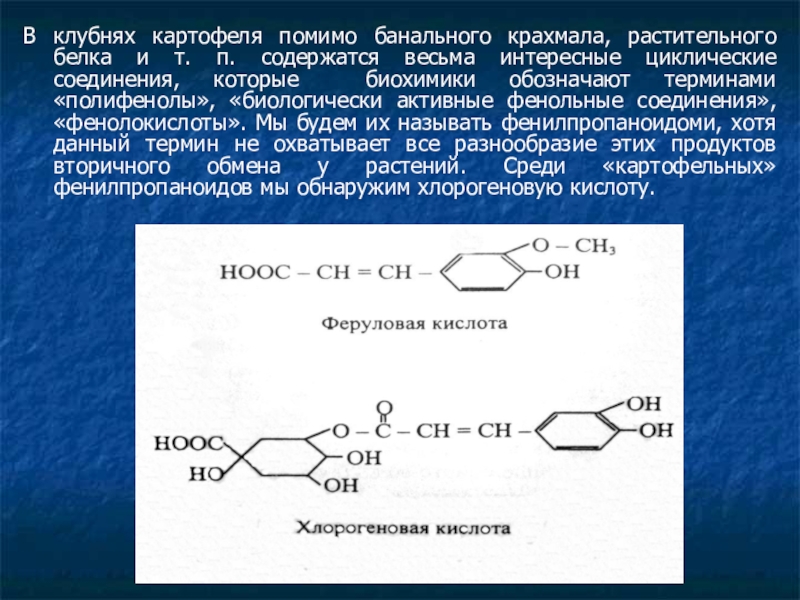 содержатся весьма интересные циклические соединения, которые биохимики обозначают терминами «полифенолы», «биологически активные фенольные соединения», «фенолокислоты». Мы будем их называть фенилпропаноидоми, хотя данный термин не охватывает все разнообразие этих продуктов вторичного обмена у растений. Среди «картофельных» фенилпропаноидов мы обнаружим хлорогеновую кислоту.