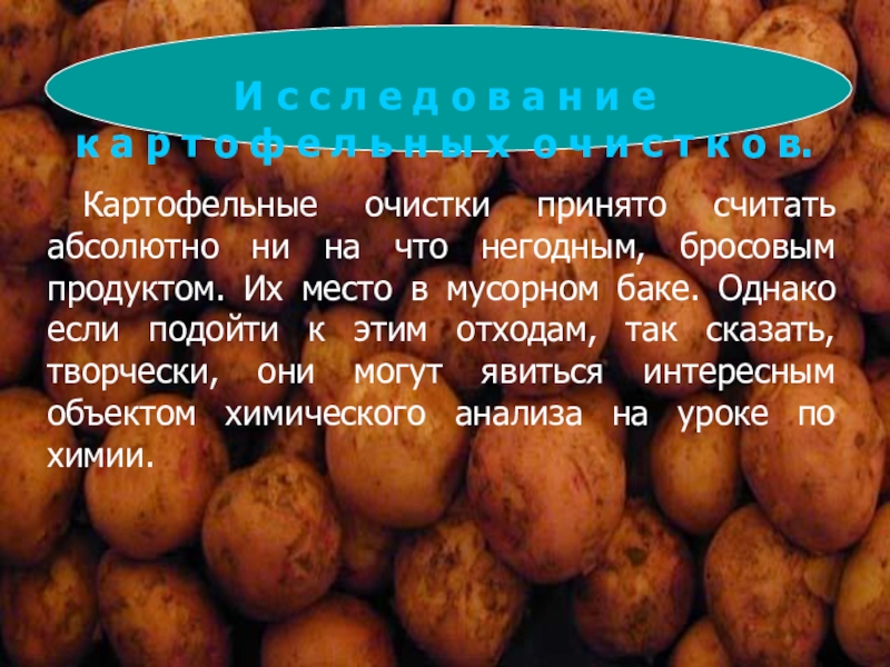 Картофельные очистки принято считать абсолютно ни на что негодным, бросовым продуктом. Их место в мусорном баке. Однако если подойти к этим отходам, так сказать, творчески, они могут явиться интересным объектом химического анализа на уроке по химии.