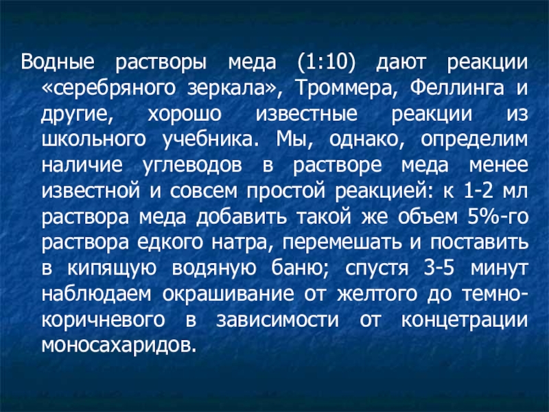 Слайд 16Водные растворы меда (1:10) дают реакции «серебряного зеркала», Троммера, Феллинга и