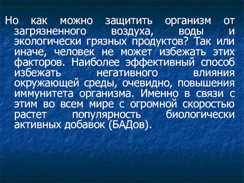грязных продуктов? Так или иначе, человек не может избежать этих факторов. Наиболее эффективный способ избежать негативного влияния окружающей среды, очевидно, повышения иммунитета организма. Именно в связи с этим во всем мире с огромной скоростью растет популярность биологически активных добавок (БАДов).