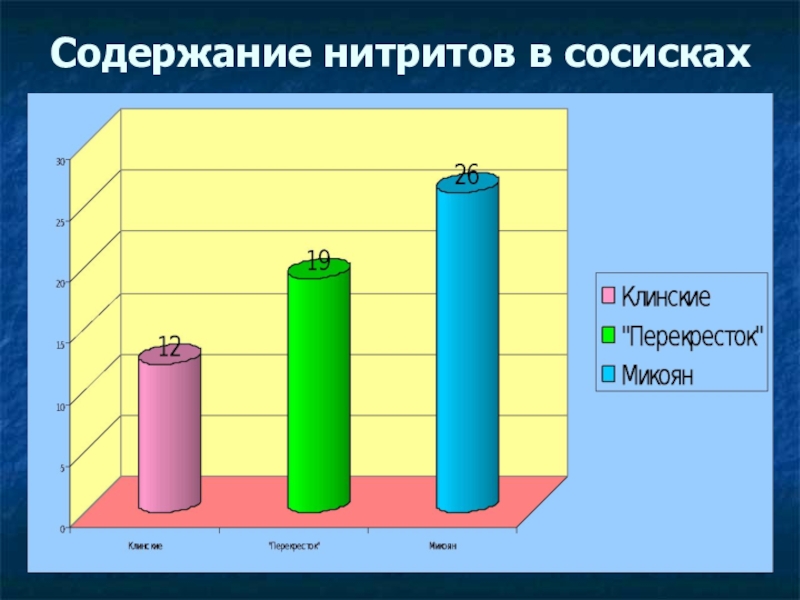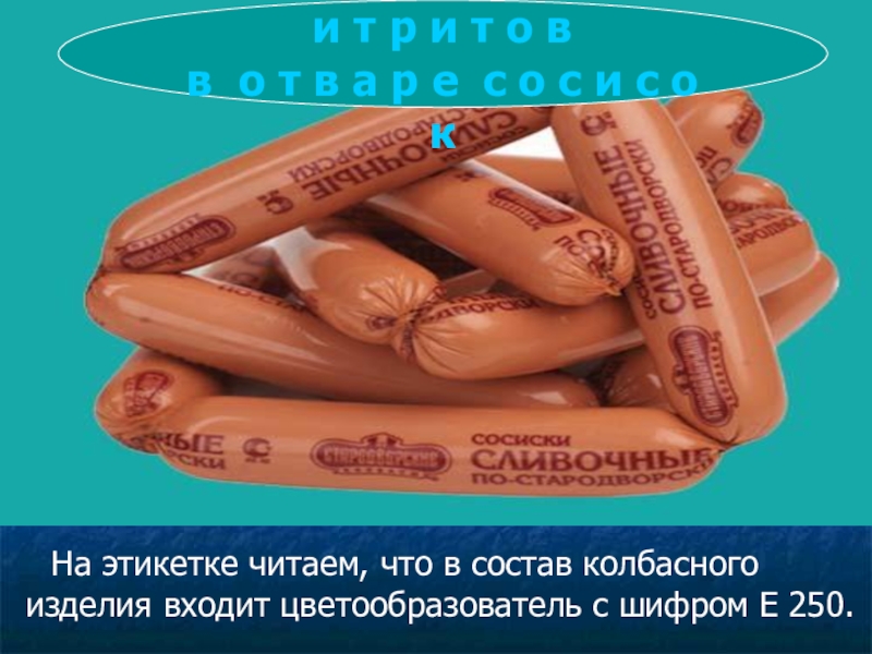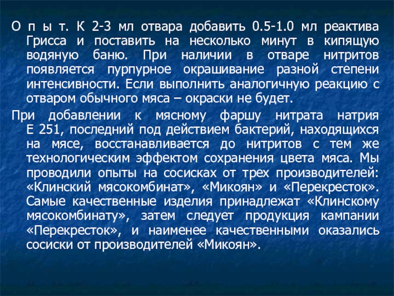 Е 251, последний под действием бактерий, находящихся на мясе, восстанавливается до нитритов с тем же технологическим эффектом сохранения цвета мяса. Мы проводили опыты на сосисках от трех производителей: «Клинский мясокомбинат», «Микоян» и «Перекресток». Самые качественные изделия принадлежат «Клинскому мясокомбинату», затем следует продукция кампании «Перекресток», и наименее качественными оказались сосиски от производителей «Микоян».