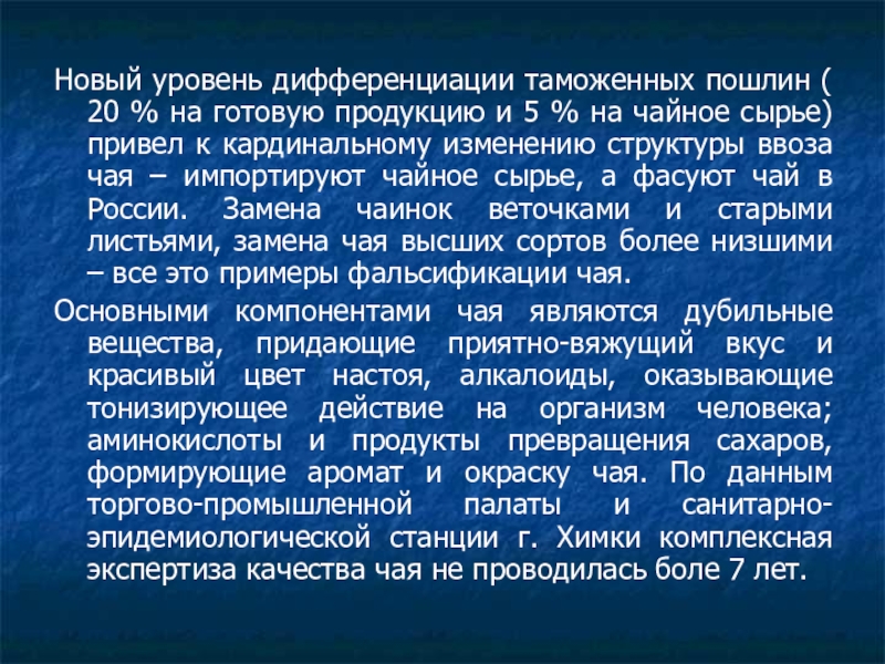 и 5 % на чайное сырье) привел к кардинальному изменению структуры ввоза чая – импортируют чайное сырье, а фасуют чай в России. Замена чаинок веточками и старыми листьями, замена чая высших сортов более низшими – все это примеры фальсификации чая.