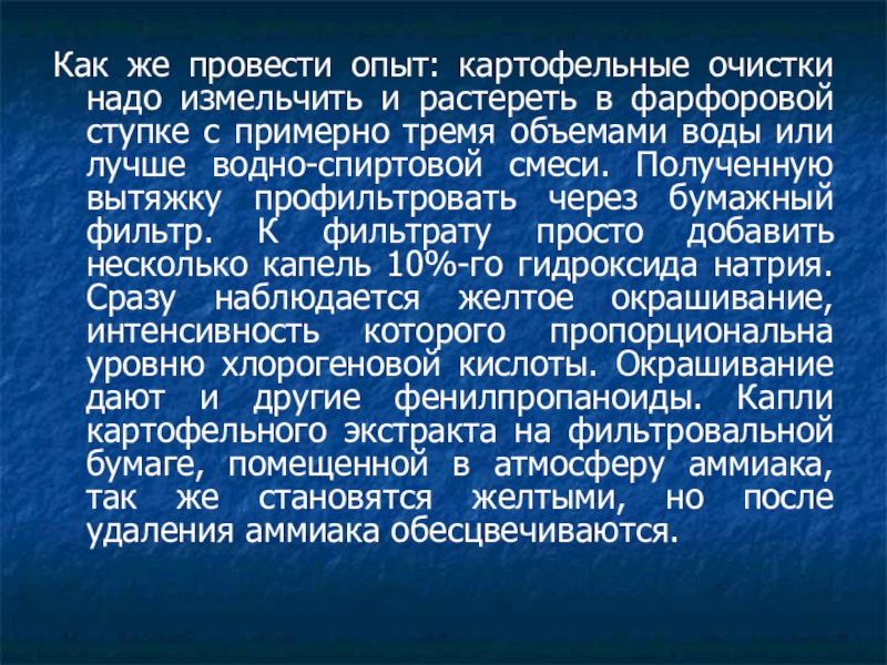 фарфоровой ступке с примерно тремя объемами воды или лучше водно-спиртовой смеси. Полученную вытяжку профильтровать через бумажный фильтр. К фильтрату просто добавить несколько капель 10%-го гидроксида натрия. Сразу наблюдается желтое окрашивание, интенсивность которого пропорциональна уровню хлорогеновой кислоты. Окрашивание дают и другие фенилпропаноиды. Капли картофельного экстракта на фильтровальной бумаге, помещенной в атмосферу аммиака, так же становятся желтыми, но после удаления аммиака обесцвечиваются.