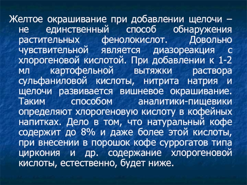 фенолокислот. Довольно чувствительной является диазореакция с хлорогеновой кислотой. При добавлении к 1-2 мл картофельной вытяжки раствора сульфаниловой кислоты, нитрита натрия и щелочи развивается вишневое окрашивание. Таким способом аналитики-пищевики определяют хлорогеновую кислоту в кофейных напитках. Дело в том, что натуральный кофе содержит до 8% и даже более этой кислоты, при внесении в порошок кофе суррогатов типа циркония и др. содержание хлорогеновой кислоты, естественно, будет ниже.