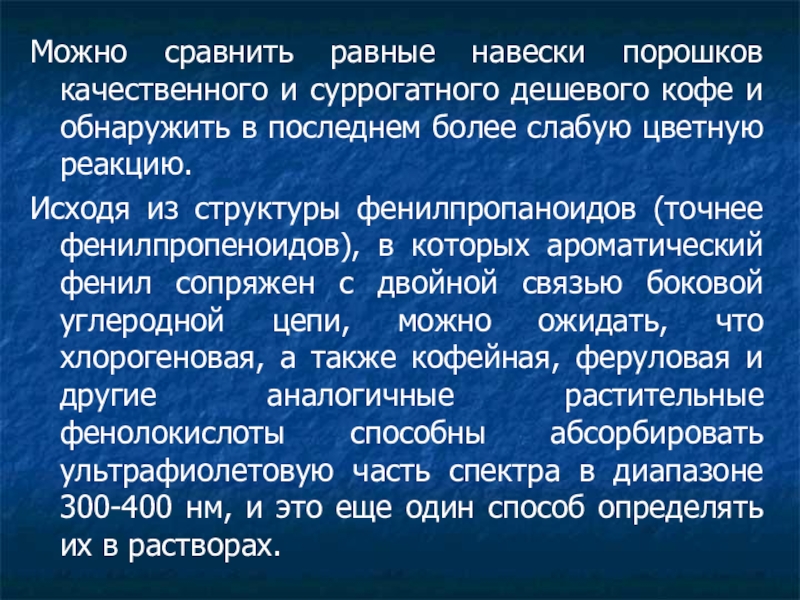 Исходя из структуры фенилпропаноидов (точнее фенилпропеноидов), в которых ароматический фенил сопряжен с двойной связью боковой углеродной цепи, можно ожидать, что хлорогеновая, а также кофейная, феруловая и другие аналогичные растительные фенолокислоты способны абсорбировать ультрафиолетовую часть спектра в диапазоне 300-400 нм, и это еще один способ определять их в растворах.