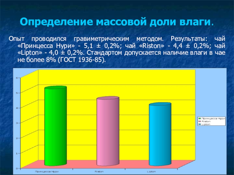- 5,1 ± 0,2%; чай «Riston» - 4,4 ± 0,2%; чай «Lipton» - 4,0 ± 0,2%. Стандартом допускается наличие влаги в чае не более 8% (ГОСТ 1936-85).