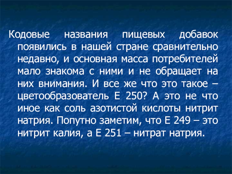 основная масса потребителей мало знакома с ними и не обращает на них внимания. И все же что это такое – цветообразователь Е 250? А это не что иное как соль азотистой кислоты нитрит натрия. Попутно заметим, что Е 249 – это нитрит калия, а Е 251 – нитрат натрия.