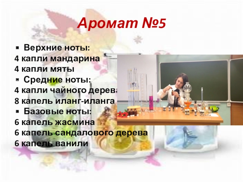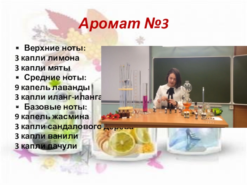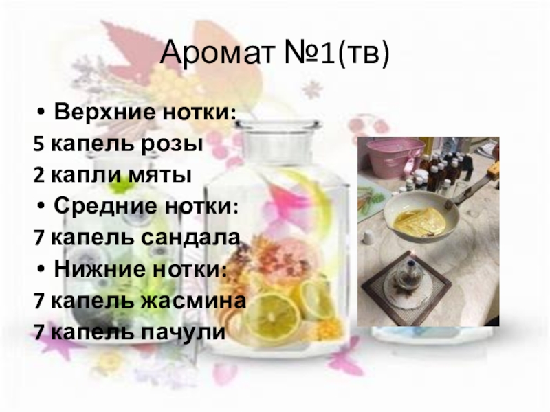 Слайд 14Необходимые пропорции для создания жидких ароматов в лабораторных условиях.
