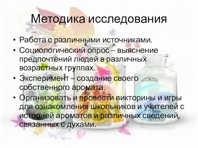 Мне захотелось узнать, как создаются ароматы в наше время, выяснить предпочтения людей разных возрастных групп, а также получить свой собственный аромат, исходя из предпочтений современного общества.