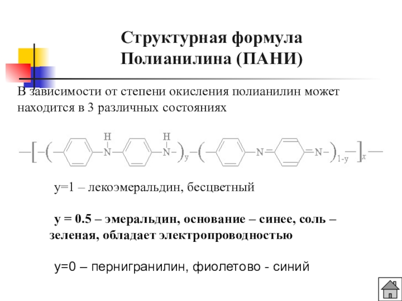 у = 0.5 – эмеральдин, основание – синее, соль – зеленая, обладает электропроводностью