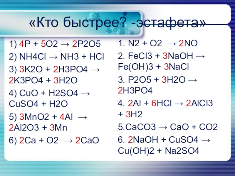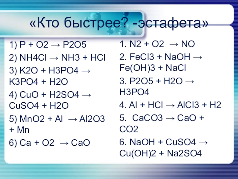 6. 2NaOH + CuSO4 → Cu(OH)2 + Na2SO4