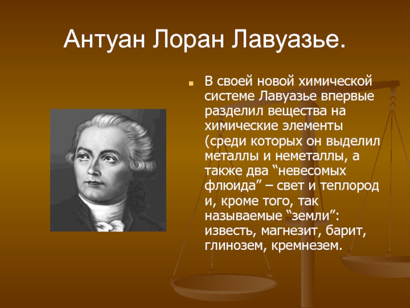 на химические элементы (среди которых он выделил металлы и неметаллы, а также два “невесомых флюида” – свет и теплород и, кроме того, так называемые “земли”: известь, магнезит, барит, глинозем, кремнезем.
