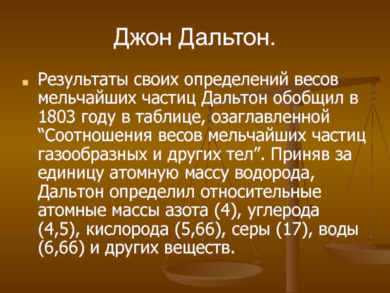 Джон Дальтон.Результаты своих определений весов мельчайших частиц Дальтон обобщил в 1803 году в таблице, озаглавленной “Соотношения весов