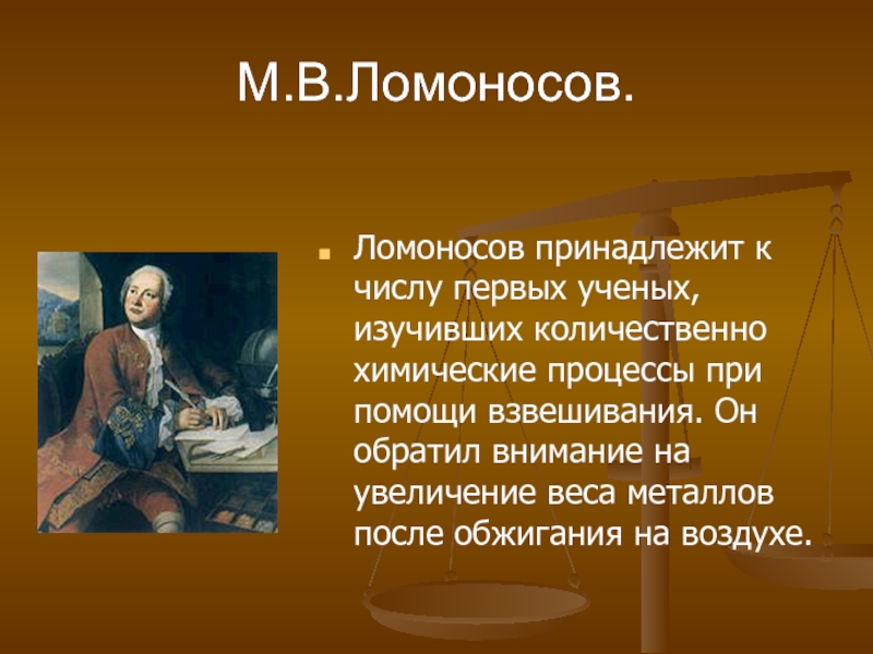 М.В.Ломоносов.Ломоносов принадлежит к числу первых ученых, изучивших количественно химические процессы при помощи взвешивания. Он обратил внимание на