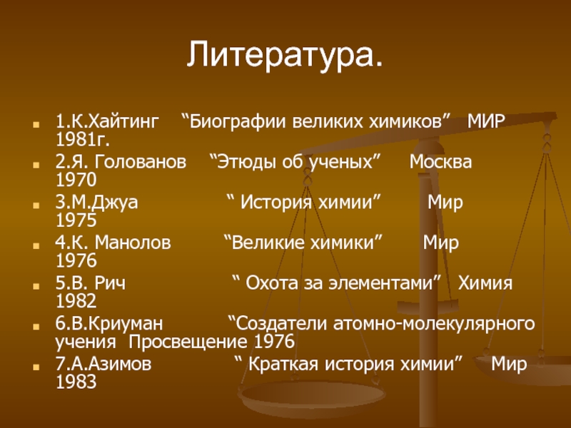 Литература.1.К.Хайтинг  “Биографии великих химиков”  МИР 1981г.2.Я. Голованов  “Этюды об ученых”   Москва