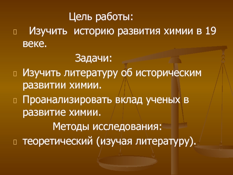 Цель работы: Изучить историю развития химии в 19 веке. Задачи:Изучить литературу об историческим развитии химии.Проанализировать вклад