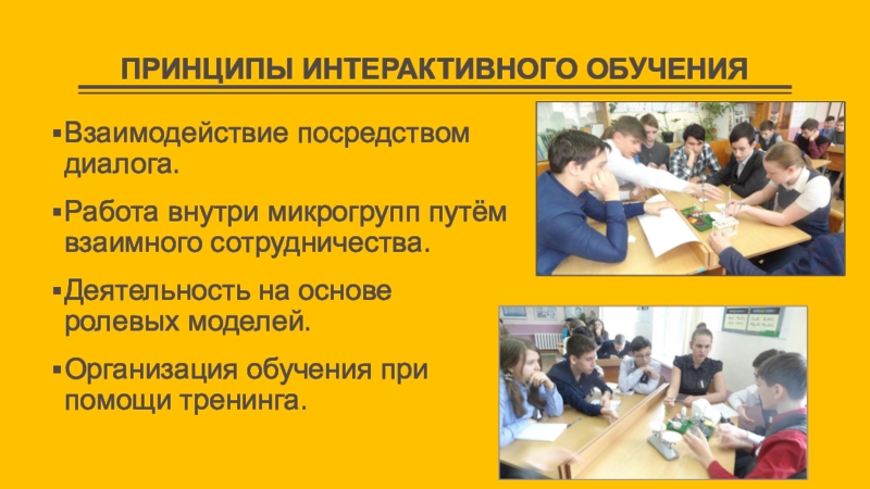 ПРИНЦИПЫ ИНТЕРАКТИВНОГО ОБУЧЕНИЯВзаимодействие посредством диалога.Работа внутри микрогрупп путём взаимного сотрудничества.Деятельность на основе ролевых моделей.Организация обучения при помощи