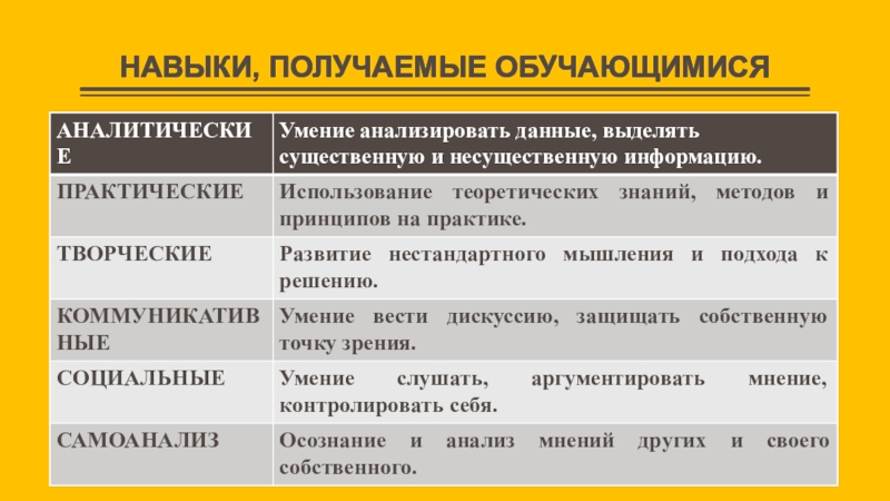 Слайд 11НАВЫКИ, ПОЛУЧАЕМЫЕ ОБУЧАЮЩИМИСЯ