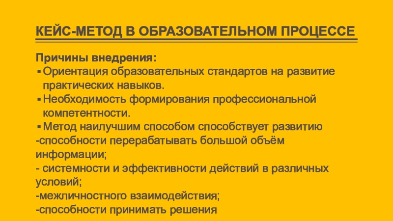 КЕЙС-МЕТОД В ОБРАЗОВАТЕЛЬНОМ ПРОЦЕССЕПричины внедрения:Ориентация образовательных стандартов на развитие практических навыков.Необходимость формирования профессиональной компетентности.Метод наилучшим способом способствует