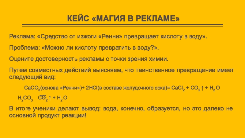 КЕЙС «МАГИЯ В РЕКЛАМЕ»Реклама: «Средство от изжоги «Ренни» превращает кислоту в воду». Проблема: «Можно ли кислоту