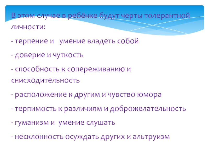 Слайд 18В этом случае в ребёнке будут черты толерантной личности: