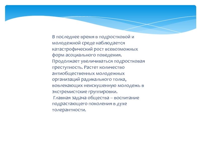 всевозможных форм асоциального поведения. Продолжает увеличиваться подростковая преступность. Растет количество антиобщественных молодежных организаций радикального толка, вовлекающих неискушенную молодежь в экстремистские группировки.