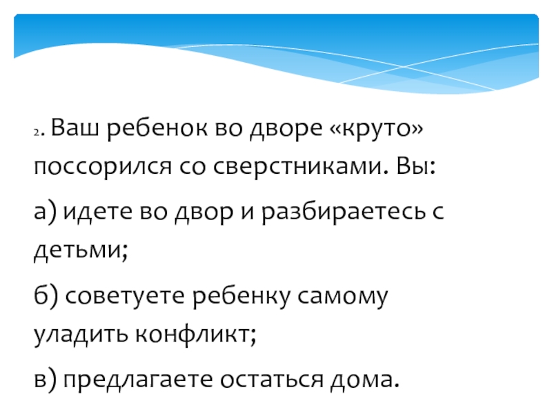 Слайд 92. Ваш ребенок во дворе «круто» поссорился со сверстниками. Вы: