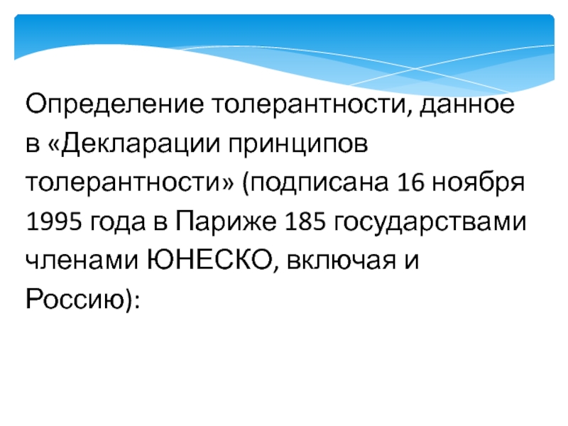 Слайд 7Определение толерантности, данное в «Декларации принципов толерантности» (подписана 16 ноября 1995