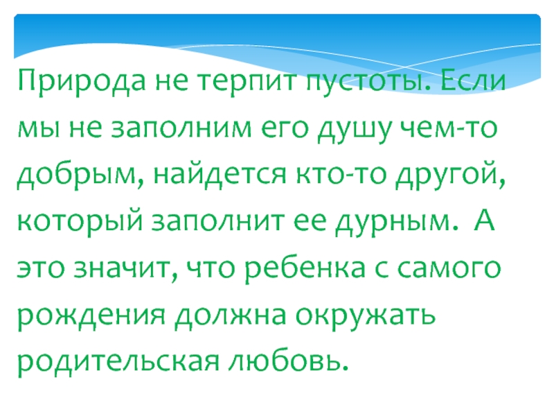 Слайд 15Природа не терпит пустоты. Если мы не заполним его душу чем-то