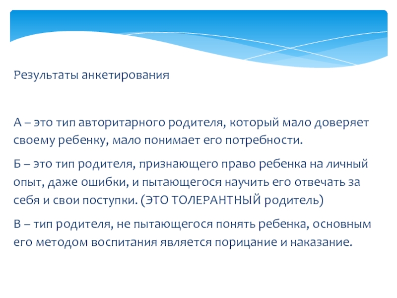 Б – это тип родителя, признающего право ребенка на личный опыт, даже ошибки, и пытающегося научить его отвечать за себя и свои поступки. (ЭТО ТОЛЕРАНТНЫЙ родитель)
