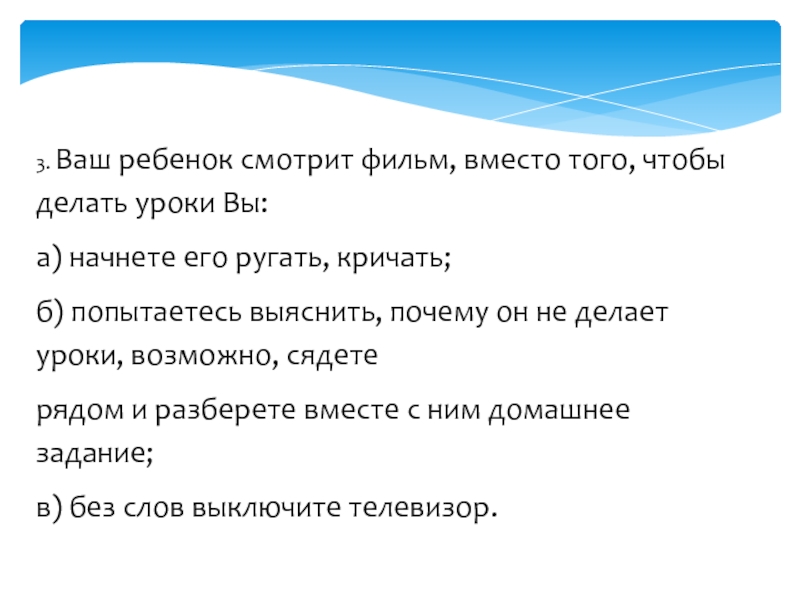 Слайд 103. Ваш ребенок смотрит фильм, вместо того, чтобы делать уроки Вы: