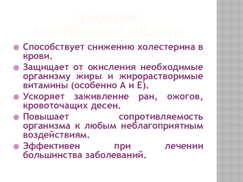 ЗНАЧЕНИЕ  АСКОРБИНОВОЙ КИСЛОТЫСпособствует снижению холестерина в крови. Защищает от окисления необходимые организму жиры и жирорастворимые витамины