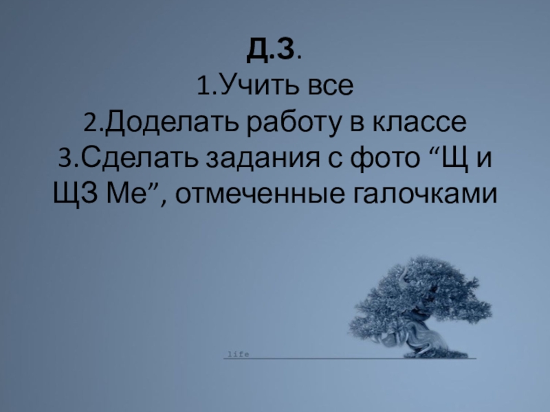 Слайд 20Д.З. 1.Учить все 2.Доделать работу в классе 3.Сделать задания с фото “Щ и ЩЗ