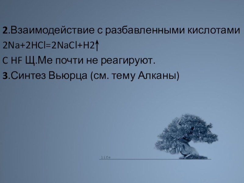 2.Взаимодействие с разбавленными кислотами2Na+2HCl=2NaCl+H2C HF Щ.Ме почти не реагируют.3.Синтез Вьюрца (см. тему Алканы)