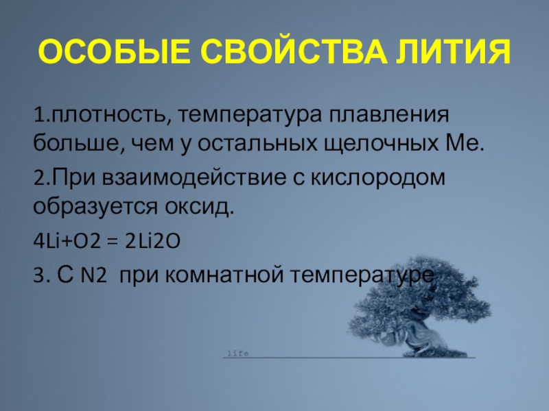 ОСОБЫЕ СВОЙСТВА ЛИТИЯ1.плотность, температура плавления больше, чем у остальных щелочных Ме.2.При взаимодействие с кислородом образуется оксид.4Li+O2 =