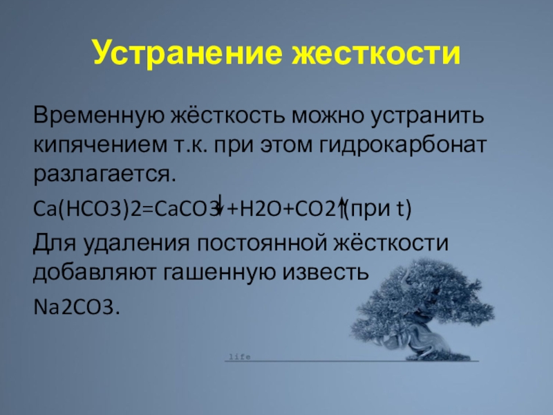 Устранение жесткости Временную жёсткость можно устранить кипячением т.к. при этом гидрокарбонат разлагается. Ca(HCO3)2=CaCO3 +H2O+CO2 (при t)Для удаления