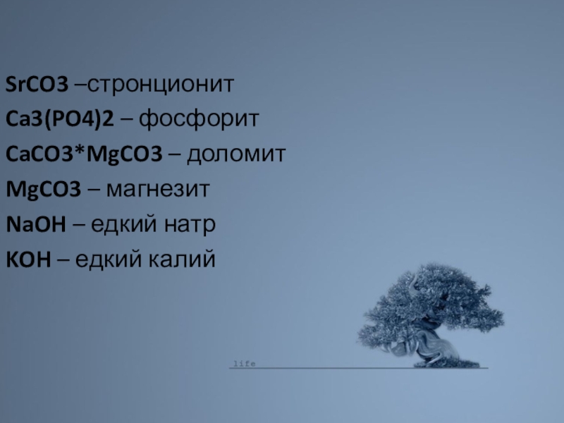 SrCO3 –стронционит Ca3(PO4)2 – фосфоритCaCO3*MgCO3 – доломитMgCO3 – магнезитNaOH – едкий натрKOH – едкий калий