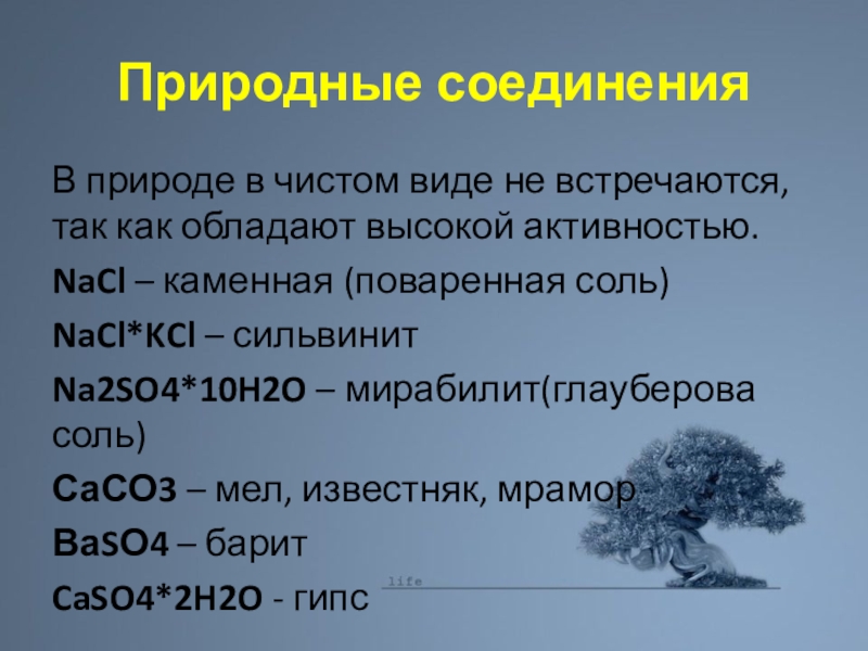 Природные соединенияВ природе в чистом виде не встречаются, так как обладают высокой активностью. NaCl – каменная (поваренная