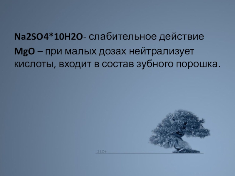 Na2SO4*10H2O- слабительное действие MgO – при малых дозах нейтрализует кислоты, входит в состав зубного порошка.