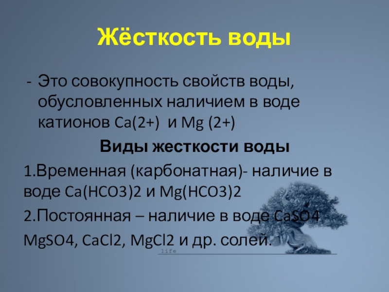 Жёсткость водыЭто совокупность свойств воды, обусловленных наличием в воде катионов Ca(2+) и Mg (2+)Виды жесткости воды1.Временная (карбонатная)-