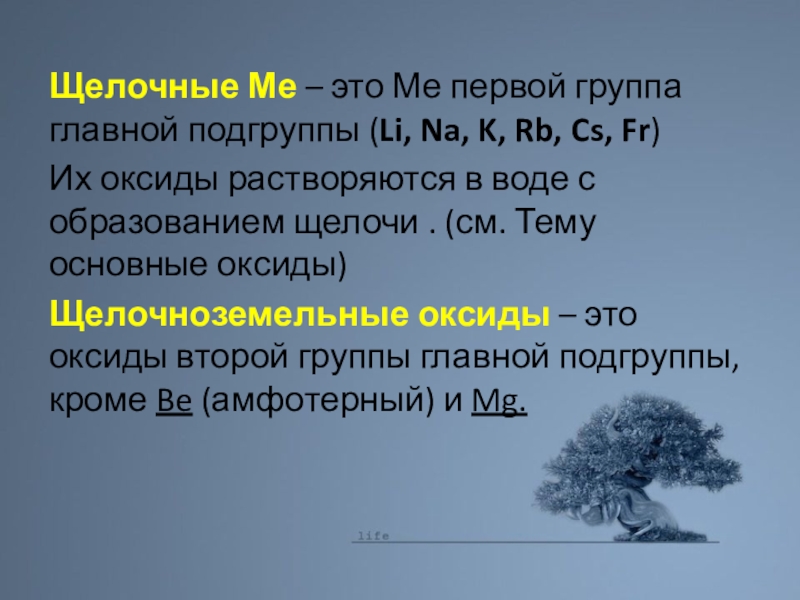 Щелочные Ме – это Ме первой группа главной подгруппы (Li, Na, K, Rb, Cs, Fr)Их оксиды растворяются в воде с образованием щелочи . (см. Тему основные оксиды) Щелочноземельные оксиды – это оксиды второй группы главной подгруппы,