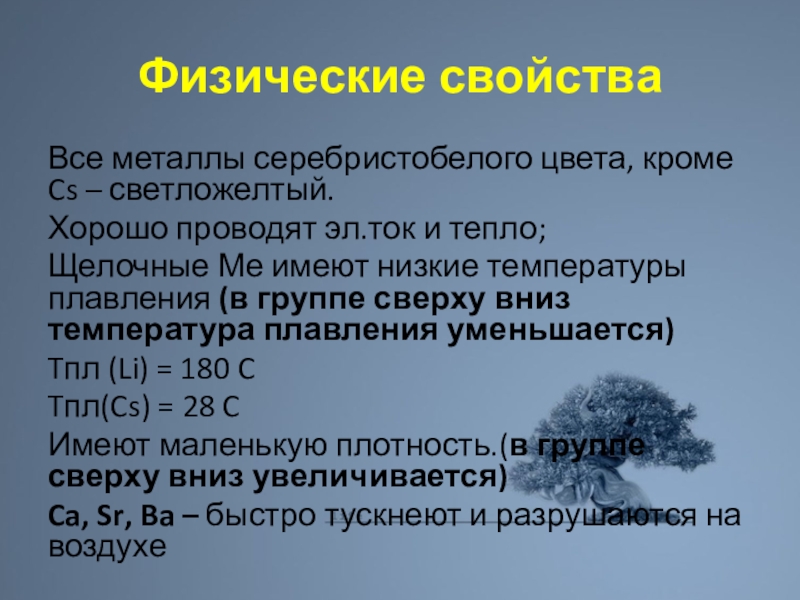 Щелочные Ме имеют низкие температуры плавления (в группе сверху вниз температура плавления уменьшается)