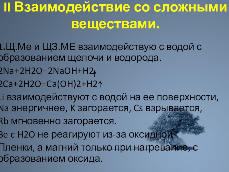 II Взаимодействие со сложными веществами.1.Щ.Ме и ЩЗ.МЕ взаимодействую с водой с образованием щелочи и водорода. 2Na+2H2O=2NaOH+H22Ca+2H2O=Ca(OH)2+H2Li взаимодействуют
