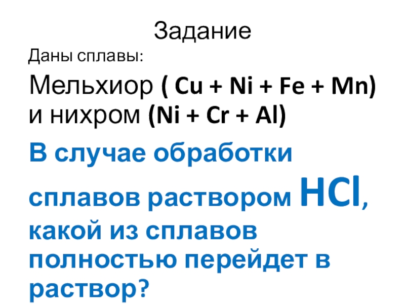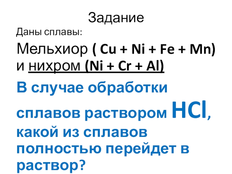 Задание Даны сплавы:Мельхиор ( Cu + Ni + Fe + Mn) и нихром (Ni + Cr + Al)В случае обработки сплавов раствором HCl, какой из сплавов полностью перейдет в раствор?
